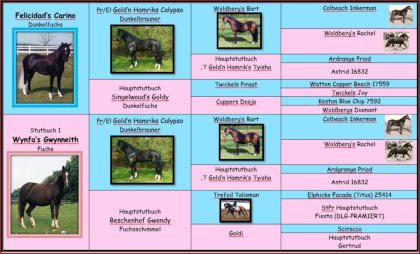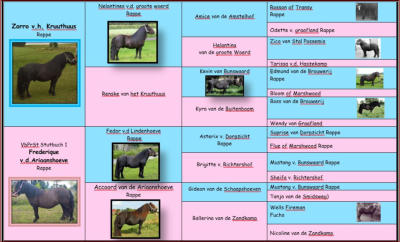 Sein Vater Zorro v.h. Kruuthuus ist ein holländischer Zuchthengst, der 2008 gekört wurde. Aufgrund seiner vielen prämien wurde seine Körung 2017 auf Lebenszeit anerkannt. Stand 2017 hat Zorro 91 registrierte Nachkommen, darunter viele Jungsieger sowie 1e und 2e prämien Stuten. VbPrSt Stutbuch 1 Stute Frederique v.d.Ariaanshoeve erwarb mehre Prämien und wurde 2017 Reservesieger Stute beim Sächsisch- Thüringer Ponytag. Sie brachte bisher einen gekörten Sohn hervor.Frederique stammt von Fedor v.d Lindenhoeve ab. Fedor wurde im alter von 3 Jahren eingetragen und sammelte seit dem sechs 1er Prämien. 1998 wurde er während der UTV zum Champion ernannt. Im Jahr 2000 gewann er die Hengstprüfung. Von ihm stammen die Siegerhengste Friso van de Heuvelhof und Florisant van Beatrixlaan ab, die jeweils eine 1er prämie erhalten haben. 2004 wurde Fedor Lebenslang auf Grund seiner Zuchtergebnisse gekört.Der Vater von Fedor ist der bekannte Asterix van Dorpzicht. Die Mutter stammt aus dem berühmten Stall Richtershof. Sie wurde im Alter von vier Jahren nach Schweden exportiert, wo sie die Siegerstute Almnäs Fresia aus der Kombination mit Wessel van de Amstelhof hervorbrachte. Mütterlicher- und Väterlicherseits gehen beide Lininen auf Die B - Linie des schottischen Marshwood Gestütest zurück. Das Gestüt brachte den Hengst Package of Marshwood herrvor. Außerdem die berümten Mutterväter wie "Newton v. Dorpzicht" und "Edmund v.d. Brouwerij". Züchte ich mit Ihm???Der Kleine ist noch nicht bei der Körkommision vorgestellt worden, daher wird er noch nicht zur Zucht genutzt.Tiny sollte dieses Jahr bei der Herbstkörung vorgestellt werden. Er wurde von Sep.2019 bis Okt.2019 auf die Körung vorbereitet. Leider hat sich der Vorsteller die Hand gebrochen, weswegen wir nicht zur Körung gefahren sind.